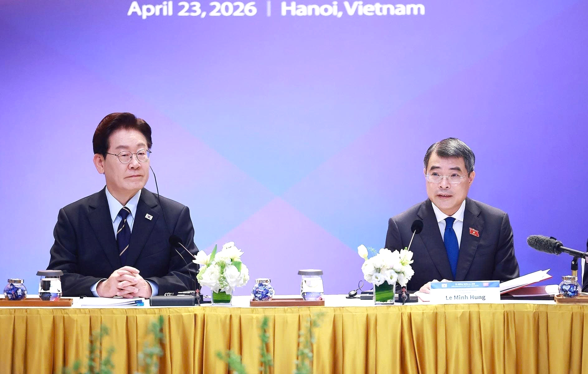 Ngày 23-4, Thủ tướng Lê Minh Hưng và Tổng thống Hàn Quốc Lee Jae Myung đã cùng chủ trì tọa đàm bàn tròn về hợp tác kinh tế, thương mại, đầu tư Việt Nam - Hàn Quốc trong khuôn khổ Diễn đàn kinh tế Việt Nam - Hàn Quốc. Sự kiện quy tụ lãnh đạo 26 doanh nghiệp hàng đầu hai nước trong các lĩnh vực năng lượng, tài chính, công nghệ, điện tử, viễn thông, chế biến - chế tạo, xây dựng, hạ tầng, thương mại, du lịch và hàng không.